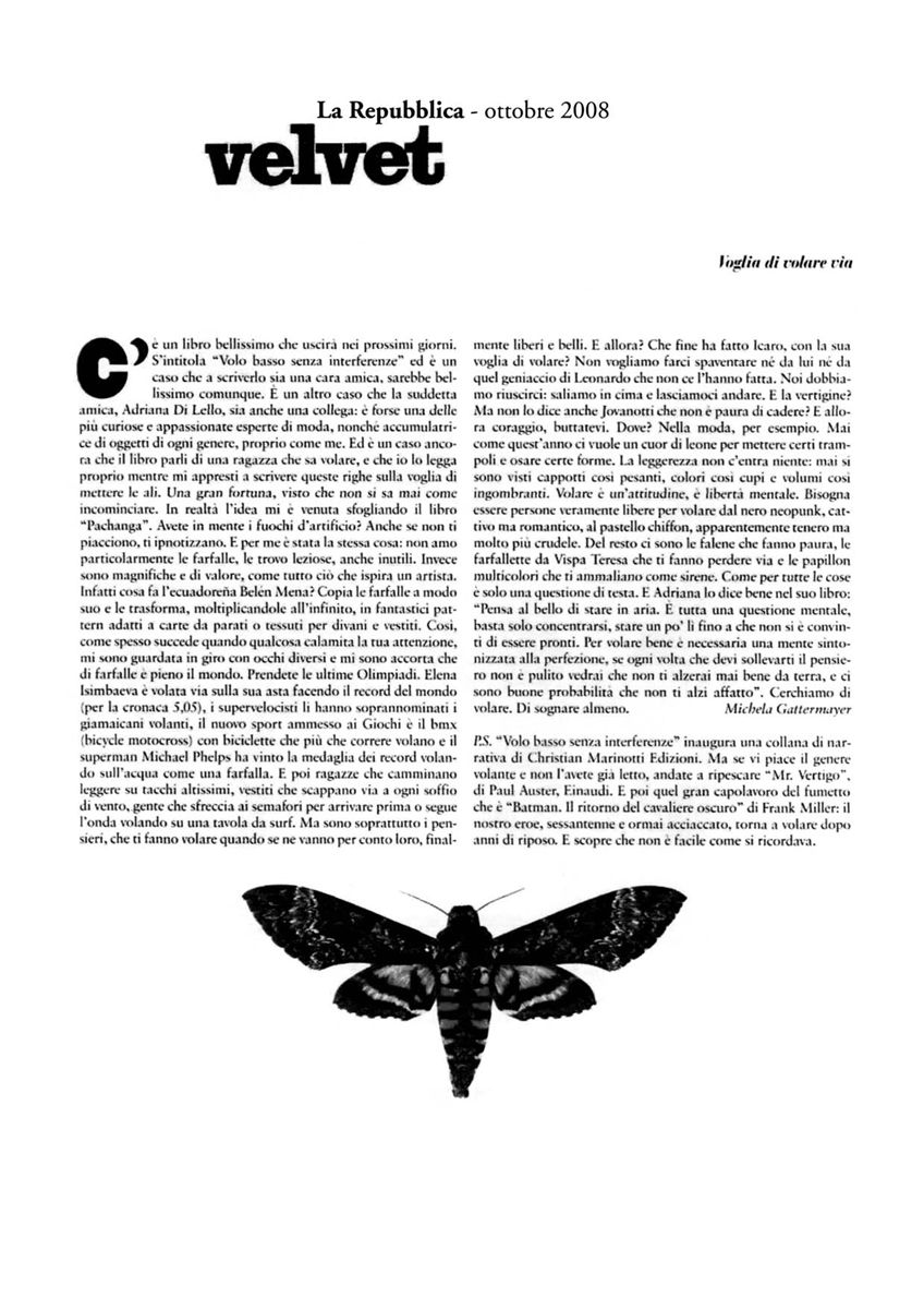La protagonista di questa storia possiede una capacità che tutti vorremmo avere: quella di volare. Le è arrivata come un dono, senza sforzo né alone di prodigio, come se spiccare il volo fosse per lei la cosa più naturale del mondo. Il suo, del resto, non è il volo di Icaro che si spinge così in alto da rischiare di bruciarsi le penne, né quello misterioso degli angeli. Più che volare, sorvola, svolazza. E, intanto, osserva ciò che avviene tra la gente. Sempre svolazzando incontra diversi personaggi, tra cui alcune vicine di casa, un poliziotto, qualche commerciante, ex attrici di teatro, tutto un variopinto mondo di strada che non sfigurerebbe in un romanzo di Pennac. Questo romanzo possiede diversi pregi. Innanzitutto quello della leggerezza, affidata a pagine in cui le parole si rincorrono allegramente, facendosi leggere d'un fiato. Poi lo sguardo, che è quello della giovinezza, capace di comunicare buon umore. Infine la curiosità con cui la protagonista si interessa delle vicende umane, cosa che porta a scoprire come la fantasia e la gioia di vivere abitano dove meno ce lo si aspetta, anche dietro l'angolo di casa. Una storia magica di una ragazza che vola, e che, volando senza mai allontanarsi troppo dal suo quartiere e dai suoi percorsi abituali, ci fa conoscere una variegata tribù di personaggi tanto stravaganti quanto ricchi di umanità.