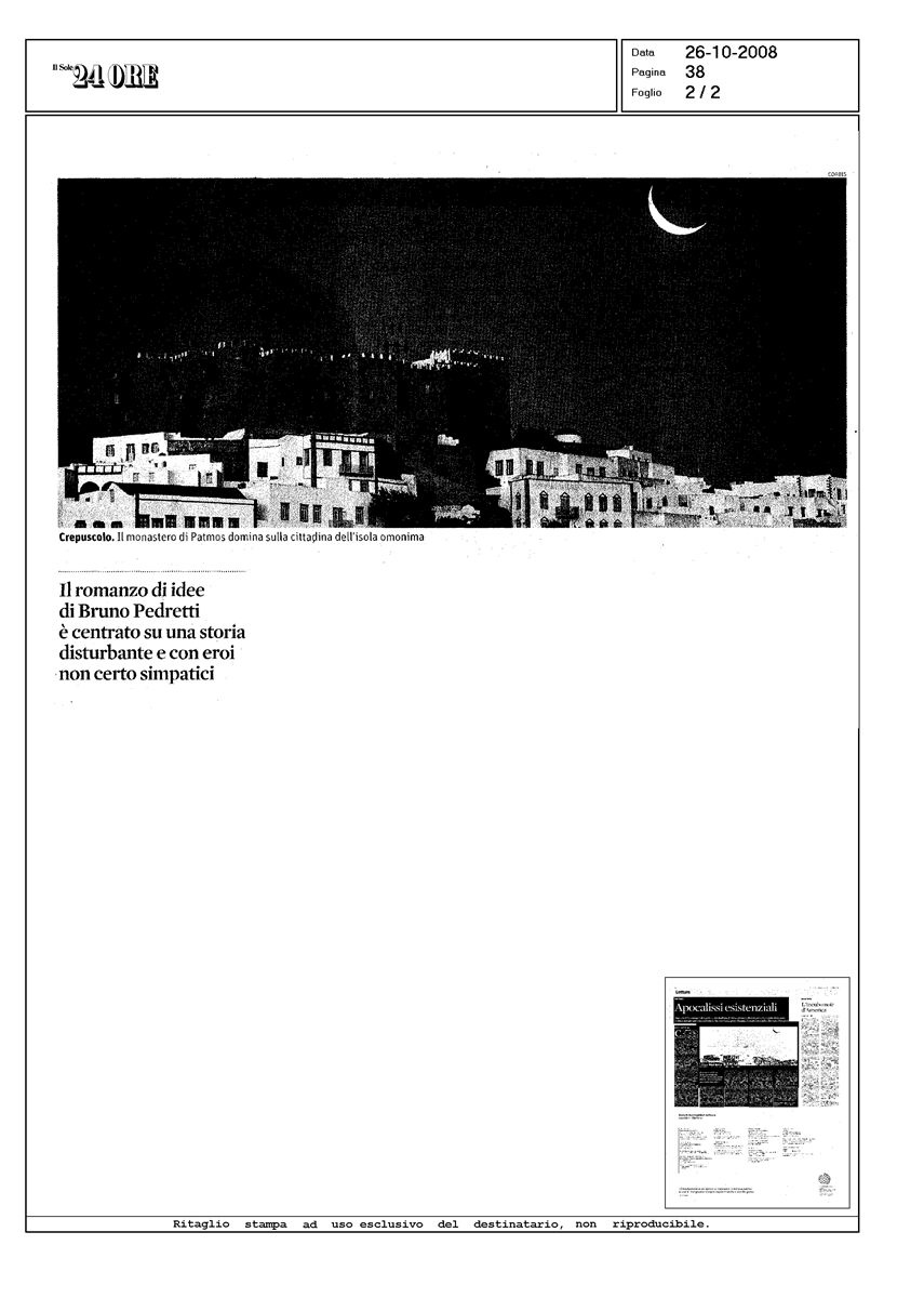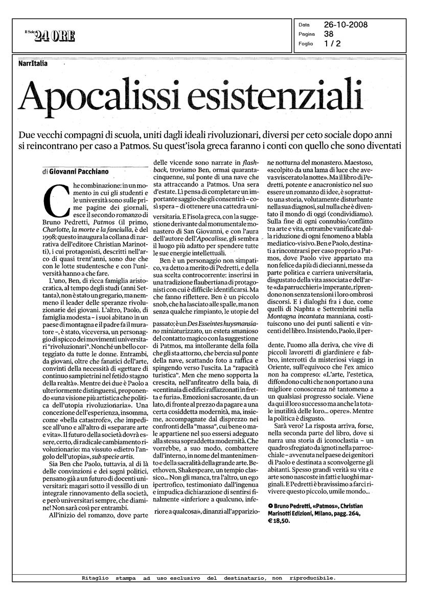 Ben, in Grecia per un breve soggiorno nell'isola di Patmos, incontra un amico che non vede da anni, Paolo. Negli anni della giovinezza Ben e Paolo hanno condiviso un sogno, comune anche a tanti altri della loro generazione: quello di cambiare il mondo. Sarebbe naturale che tra i due si ristabilisse la confidenza di un tempo. Ma non è così. Paolo è sfuggente, enigmatico. Cosa nasconde il suo comportamento? E perché, come Ben appura ben presto, ha deciso di vivere nella piccola isola greca, rinunciando a una brillante carriera universitaria in cambio di una vita fatta di espedienti? Inizia così da parte di Ben un'indagine che lo porta a ricostruire l'episodio di un atto vandalico nei confronti di un antico quadro che sembra aver segnato una svolta nella vicenda esistenziale dell'amico. L'indagine si colora sempre più di mistero, ma il romanzo trova il suo senso ultimo non tanto nella soluzione del giallo quanto nel metterci di fronte, come se fossero nostre, alle scelte esistenziali dei protagonisti: quella di Ben, che, pur avendo, come Paolo, coltivato il sogno di un ideale da realizzare in un futuro prossimo, ha poi accettato di venire a patti con la realtà, e quella di Paolo, deciso a non cedere ad alcuna forma di compromesso. Patmos, attraverso una scrittura che lega la trama degli eventi alle vicende interiori, è il romanzo di una generazione, ma più in generale mette in scena un problema eterno, l'aspirazione a redimere il mondo in cui viviamo.
