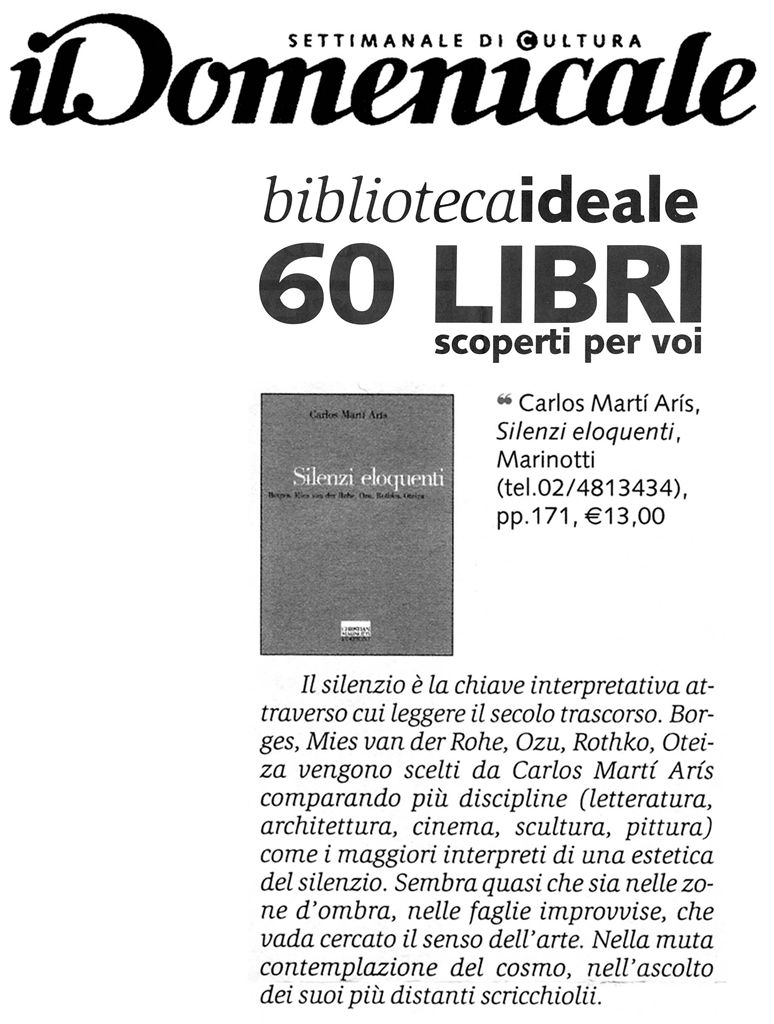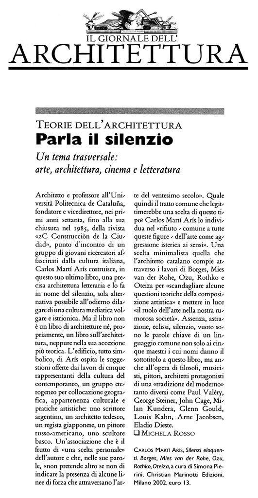 Mentre l’irrequieto Ventesimo secolo è da poco terminato, cresce l’importanza di un gruppo ristretto di opere e di artisti, radicati proprio in questo ultimo secolo, che hanno coltivato la poetica del silenzio e che sono stati capaci di interpretare, per mezzo di questa, la caotica e ambigua realtà della nostra epoca. Queste pagine sono destinate a decifrare alcune interpretazioni di questa poetica del silenzio. Carlos Martí tesse il suo discorso attraverso l’analisi comparata delle opere di uno scrittore, Borges, di un architetto, Mies van der Rohe, di un regista, Ozu, di un pittore, Rothko, e di uno scultore, Oteiza, arricchendo la sua trama con il sostegno e il confronto delle parole di filosofi, musicisti e poeti.L’associazione di questi cinque nomi rappresenta una precisa scelta dell’autore tesa ad indicare la presenza di alcuni poli di attrazione o linee di forza che attraversano l’arte del Ventesimo secolo, mettendo in evidenza quanto discipline tanto diverse tra loro come la letteratura, l’architettura, il cinema, la pittura e la scultura abbiano la stessa radice in un carattere specifico della conoscenza umana. Inoltre, al di là delle pur importanti differenze geografiche e culturali che li distinguono, c’è uno specifico tratto comune nell’opera di questi cinque maestri: il loro rifiuto dell’arte intesa come aggressione isterica al significato promossa dalla pseudo-cultura critica e mediatica, e l’affermazione dell’arte come contemplazione, introspezione destinata a svelare il mistero del mondo. Questo saggio e il suo tema - il silenzio nelle sue molte possibili accezioni - risultano quindi essere non solo un espediente per scandagliare alcune questioni teoriche della composizione artistica e per evidenziare il ruolo delle discipline artistiche nella nostra rumorosa società, ma si presentano anche come precisa proposta di metodo storico-analitico, sintetizzabile con le parole del pittore spagnolo, Ramon Gaya, quando dice: “Ove ci rendiamo conto della naturalità e della verità dell’arte, in quello stesso momento, noi ci rendiamo conto dell’artificialità e della menzogna della critica d’arte”.