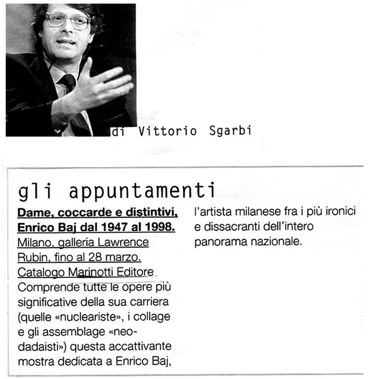 Enrico Baj è il massimo pittore italiano contemporaneo. Protagonista dell’avanguardia internazionale degli anni Cinquanta, fu tra i fondatori del movimento Arte nucleare e del Mouvement pour une Bauhaus Imaginiste. Utilizzando con ironica fantasia tecniche inconsuete, come specchi frantumati e ricomposti, complesse costruzioni eseguite con il popolare gioco del “meccano” e, soprattutto, riproponendo con grande abilità il collage (come nella lunga e fortunata serie dei Generali e delle Dame), conduce ormai da molti anni un discorso personale e coerente di demistificazione dell’arte accademica. E’ stato tra i primi in Italia negli anni Cinquanta a recuperare la “figurazione” nella pittura contro il predominio imperante dell’astrattismo, accogliendo nelle sue opere oggetti di uso comune come bottoni, rocchetti, spazzole, distintivi, materiale da passamaneria, ecc., assemblando così opere traboccanti di ironia al limite del grottesco, per irridere e sbeffeggiare con mirabile satira politica e di costume.