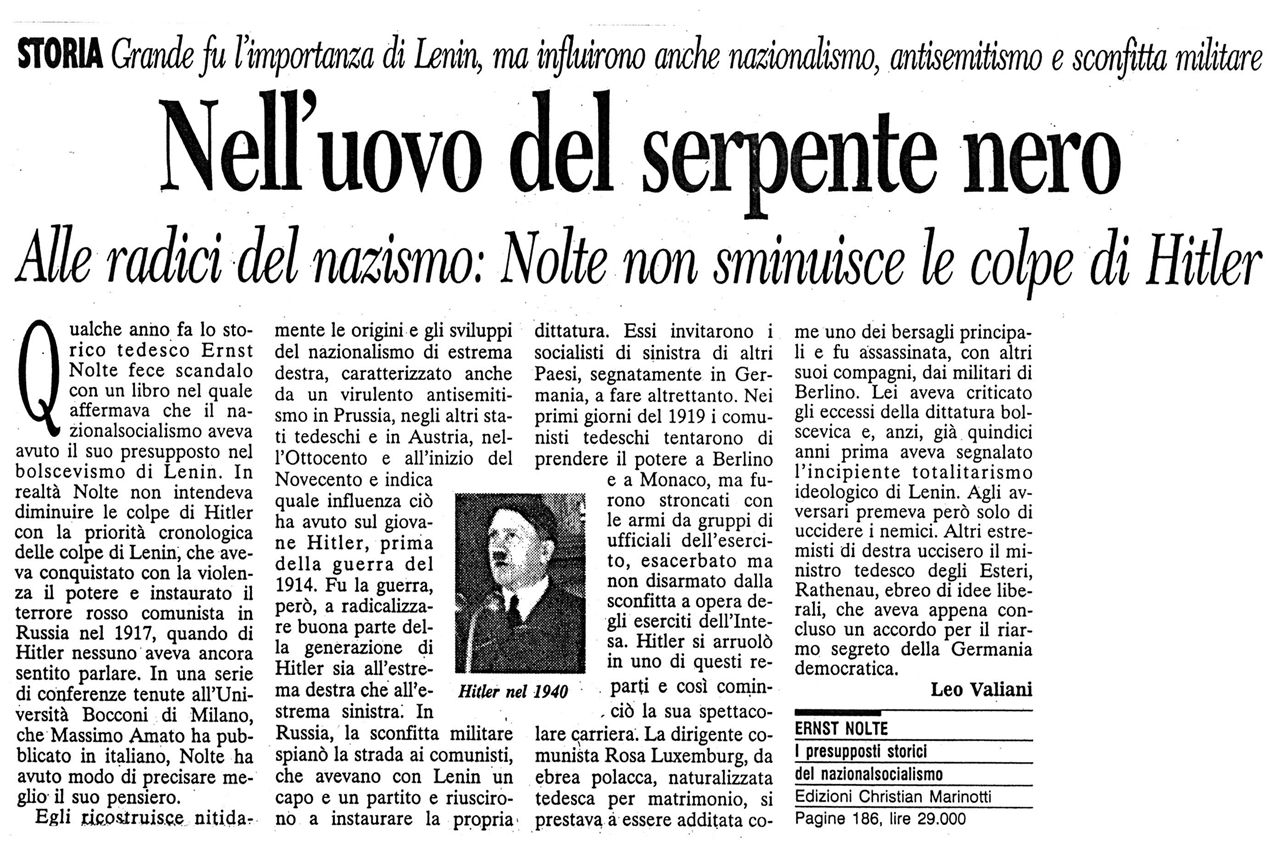 Ernst Nolte, nato nel 1923, allievo di Martin Heidegger e di Eugen Fink, è uno dei maggiori storici viventi. Assieme a François Furet e a Renzo De Felice, con i quali nel passato ha stretto proficui rapporti e scambi epistolari ormai famosi, Nolte può essere considerato uno dei pionieri di quel paradigma interpretativo del Novecento teso a fornire una chiave di lettura equilibrata, ma allo stesso tempo profonda e coraggiosa, dei fenomeni ideologici che hanno caratterizzato il nostro secolo. Un paradigma interpretativo che proprio per questo ha dovuto subire, negli anni passati, attacchi anche violenti, ma che, alla prova del tempo, si è mostrato più forte di ogni critica ideologica.