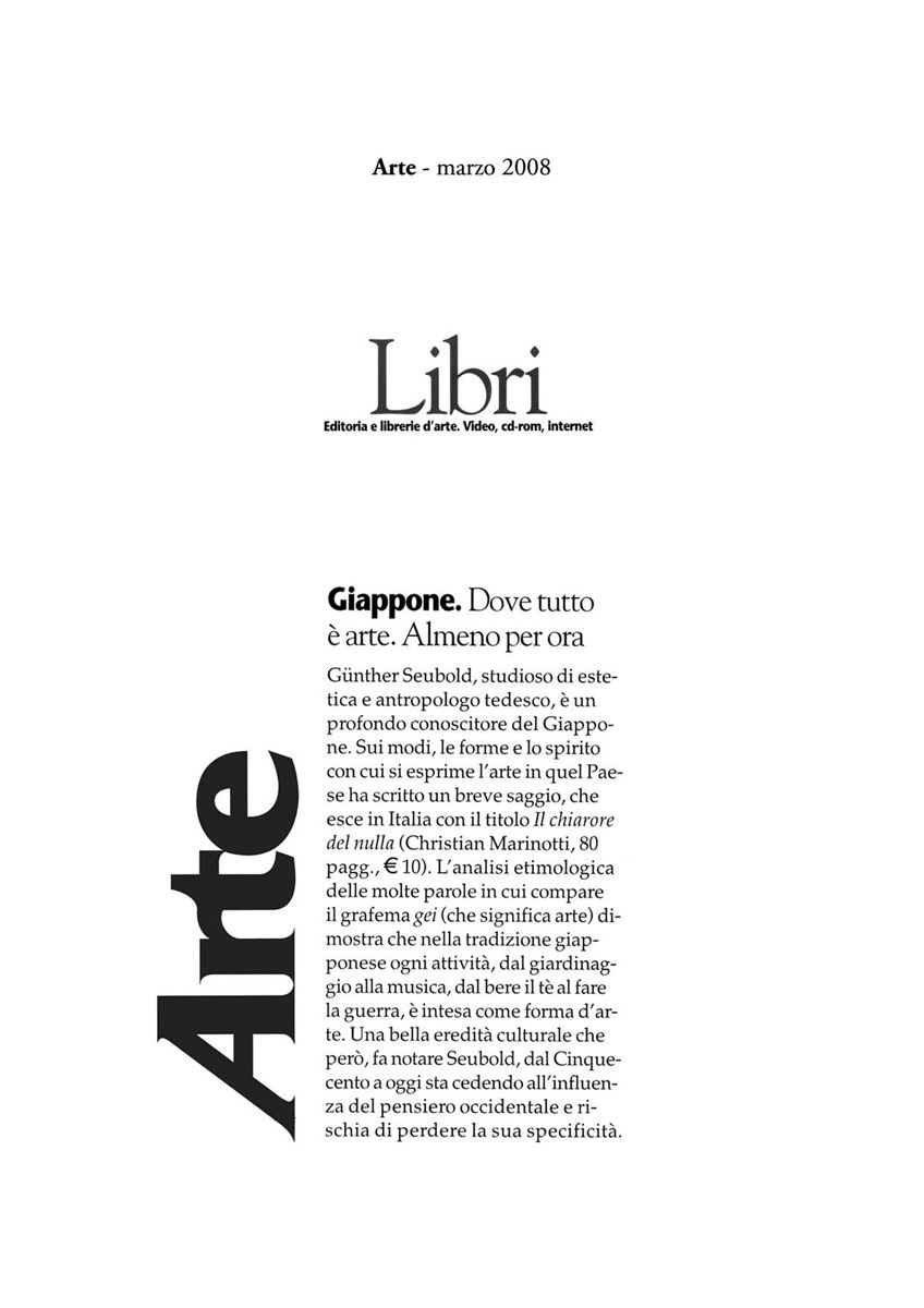 Profondo conoscitore ed amante del Giappone e della sua cultura, tanto da eleggerlo quale sua seconda patria, Günter Seubold ci regala in questo breve saggio una sorta di viaggio – fra tradizione, sensibilità ed emozione – in un paese tanto affascinante e misterioso quanto solo apparentemente così distante dal nostro. Il punto di partenza è proprio questo: l'influsso della cultura occidentale, già a partire dal XVI secolo, sulla concezione dell'arte e conseguentemente della vita e del suo modo tutto particolare di concepirla del Giappone attuale. E'un viaggio intrapreso quasi in punta di piedi: l'autore prende per mano il lettore e, quasi fosse un bambino, lo accompagna su un sentiero lungo il quale egli apprenderà come qualsiasi attività quotidiana (musica e giardinaggio, bere il tè e far la guerra, ...) sia intesa ed amata in Giappone come una forma d'arte. Come ogni bel viaggio, è un vero e proprio rito di iniziazione, al termine del quale parole quali geinô (l’arte del “saper fare”), geidô (l’arte del “saper andare”) e geijutsu (l’arte del “saper essere”) assumeranno un significato del tutto nuovo e spalancheranno un orizzonte inaspettato di pulizia formale e passione, di rigore e naturalezza, di armonia e continuità tra passato e presente. E’ un viaggio che, sul finale, si tinge di disincanto: quella che Seubold definisce l’ “europerizzazione” del Giappone attuale altro non è che il grido d’allarme contro la superficialità diffusa, l’incapacità di guardarsi dentro e riscoprire quelle origini che, sole, restituiscono un popolo alla sua cultura ed alla sua storia.