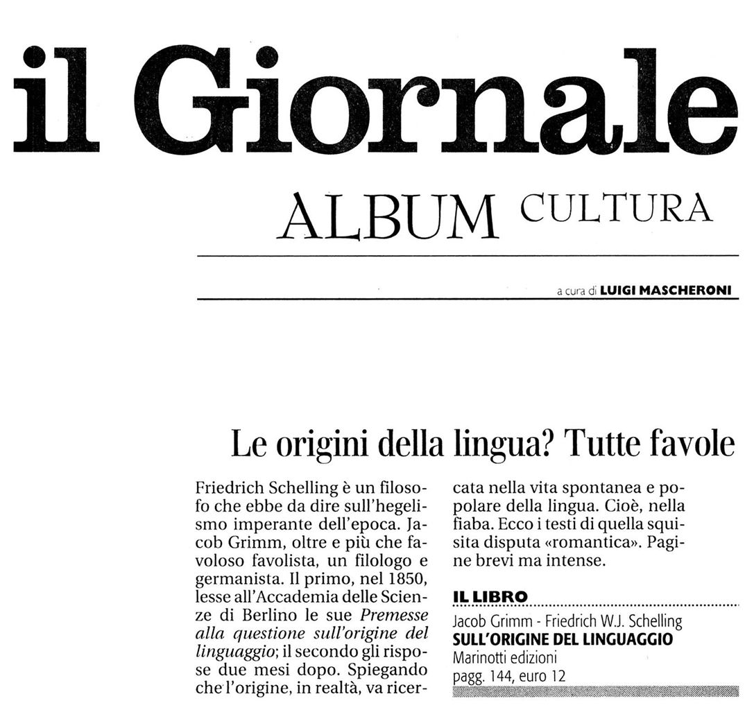 Nel novembre del 1850 Schelling leggeva all’Accademia delle Scienze di Berlino le sue Premesse alla questione sull’origine del linguaggio. Appena due mesi dopo, nel gennaio del 1851, Jacob Grimm, forte della sua ormai incontestabile affermazione nell’ambito della germanistica nascente, proponeva a sua volta al medesimo ed autorevolissimo uditorio la propria interpretazione dell’origine del linguaggio.