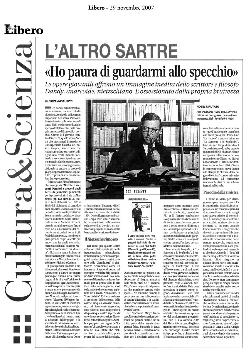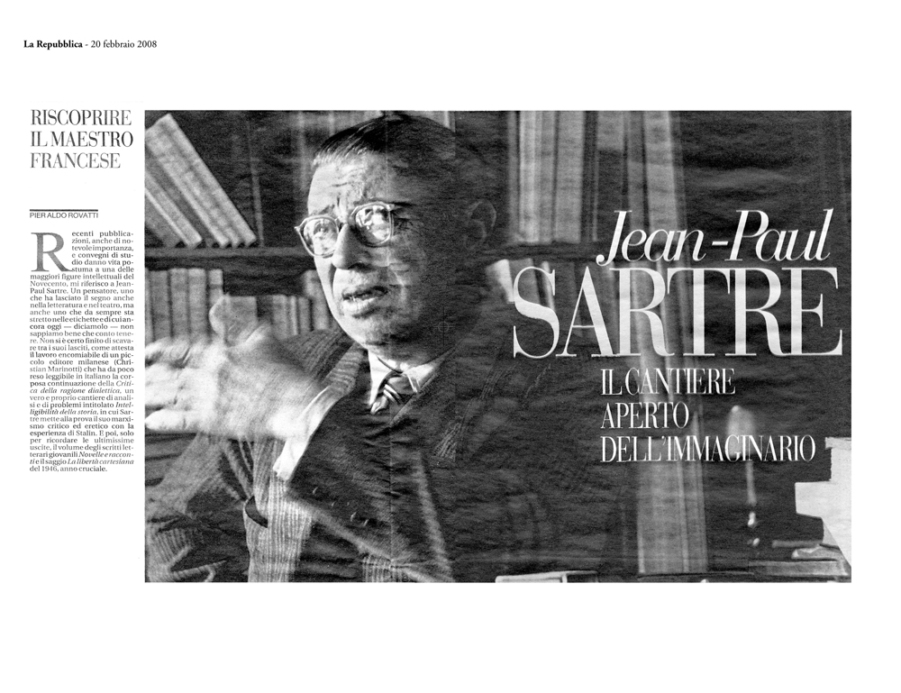 La Christian Marinotti Edizioni si fa promotrice di una nuova iniziativa di grande interesse per gli studiosi e per gli appassionati lettori di Jean-Paul Sartre. Si tratta della pubblicazione dei testi letterari giovanili del noto filosofo francese, elaborati negli anni 1922-1927, e per la prima volta tradotti in italiano.