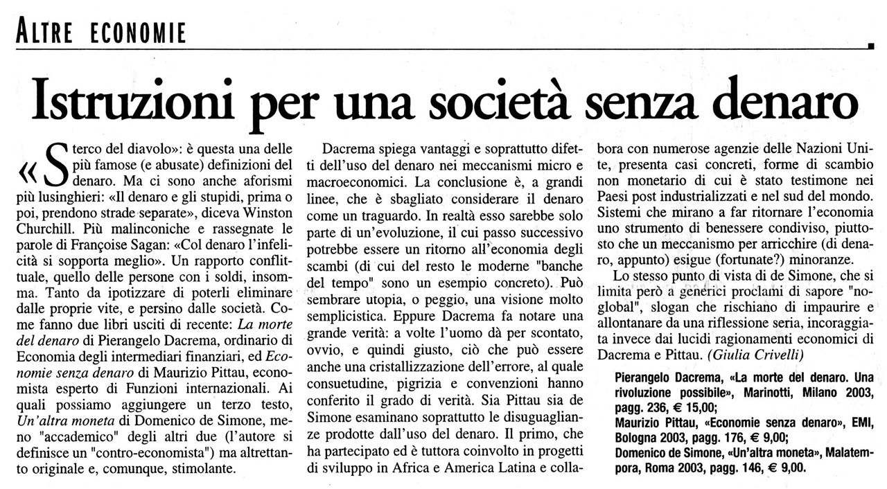 Il denaro, oggetto oscuro e ingovernabile, meta e ossessione degli sfruttati non meno che degli sfruttatori, può essere abolito. Non è utopistica questa grande e pacifica rivoluzione, che dia origine a un’economia nuova e più brillante, un’economia che non spenda energie preziose in una maniacale contabilizzazione di ogni aspetto della ricchezza, un’economia atta a soddisfare i bisogni di tutto il pianeta e non solo di una sua frazione, e a dare contenuto sostanziale a espressioni abusate come «mercato» e «democrazia economica». Un’economia finalmente fusa e confusa con il resto della vita.