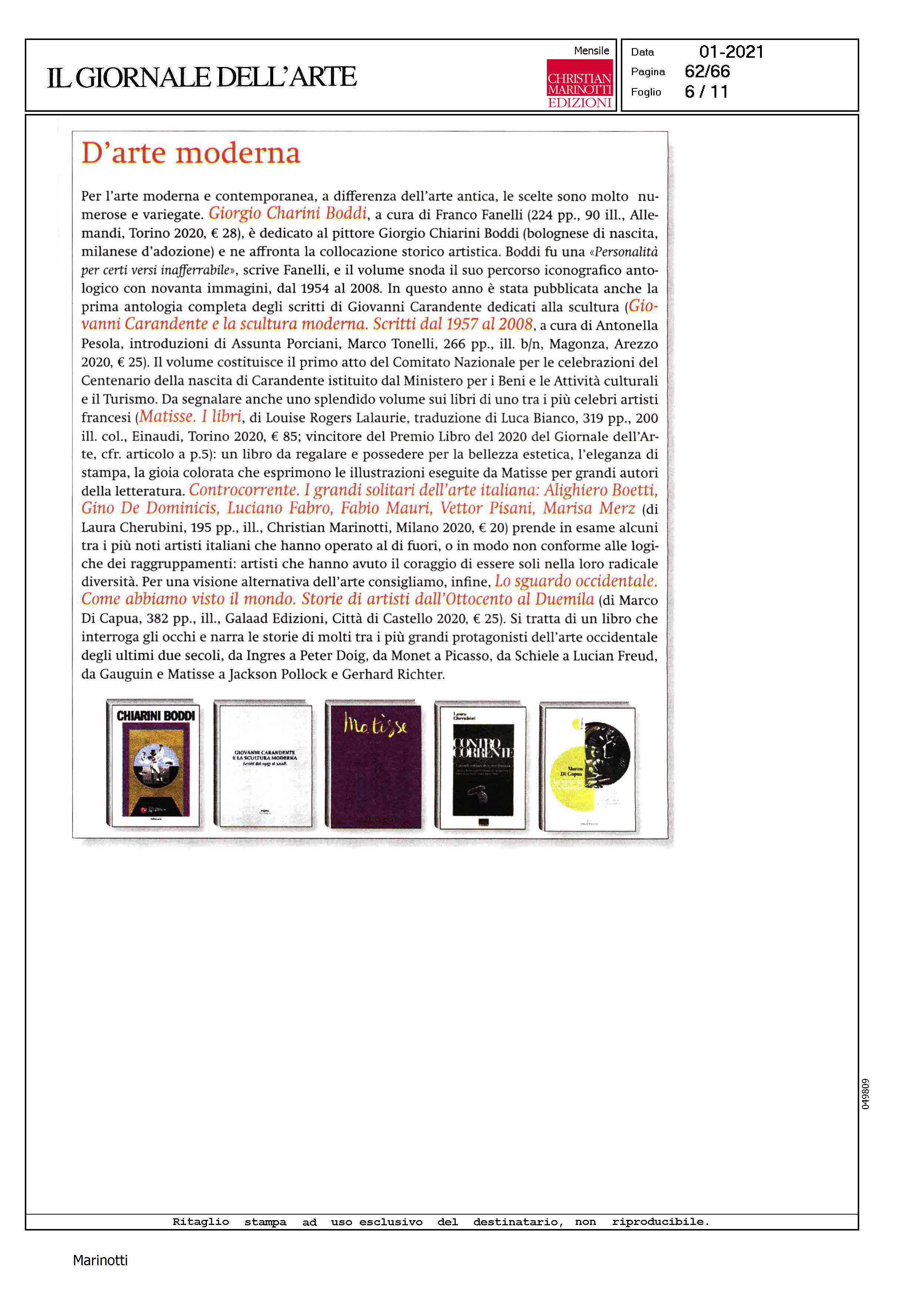Il Giornale dell'arte Dicembre 2020"Il libri da leggere D'arte moderna"Controcorrente. I grandi solitari dell'arte italiana.